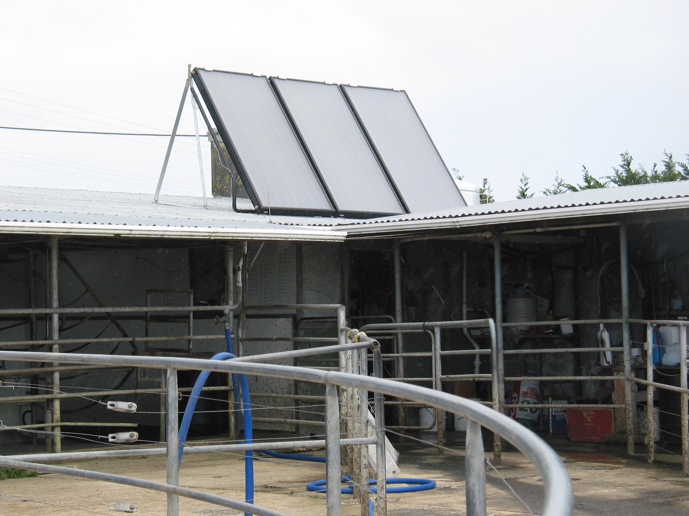 This SUNZ installation comprises of 3 x 2.5m2 solar collectors fitted to a 500l dairy cylinder with solar ports. The farm is a 90 hectare block milking 300 cows through a 32 aside herring bone. The farm is a winter milker so the solar collectors are evevated for better winter performance. The power that is used to “top up” and maintain the temperature has been converted to a night rate which is half the price on normal day rate.